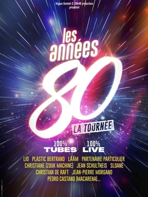 Hugues Gentelet & 20h40 Productions présentent Les Années 80, La Tournée Les Années 80, La Tournée c’est une grande fête 100% Live avec LIO, PLASTIC BERTRAND, LÂÂM, PARTENAIRE PARTICULIER, BONEY M LEGEND, JEAN SCHULTHEIS, SLOANE, CHRISTIAN DE RAFT, JEAN-PIERRE MORGAND, PEDRO CASTANO (MACARENA)… Ils sont réunis sur scène pour vous faire (re)vivre en live leurs plus grands tubes de vos années cultes. Assistez à un show, avec leurs musiciens, où tout a été pensé pour une soirée d'anthologie !
